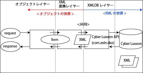 上記のうち、XML DBレイヤーはCyber Luxeonで用意されているJava APIですので、実際にサンプルアプリケーションで実装するのは「オブジェクトレイヤー」と「オブジェクト/XML変換レイヤー」になります。