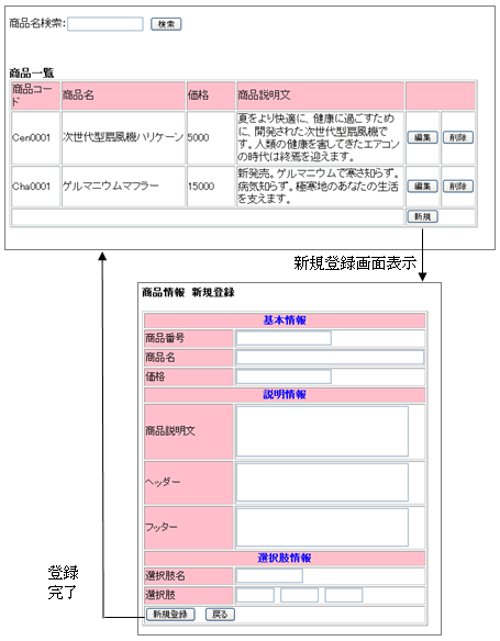 「商品情報 新規登録」画面は、商品一覧の新規登録ボタンを押下すると表示されます。「商品情報 新規登録」画面で商品情報を入力し「新規登録」ボタンを押下すると、XML DBに商品データが新規XMLとして作成されます。